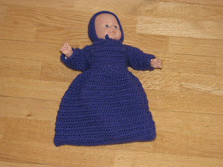 I have developed quite a collection of baby doll patterns that don't quite fit the Mary Maxim doll, but can be adjusted with some work. Today's outfit comes is the "Tiffany" pattern from Harold Magelson & Son's Kith and Kin Kids to Crochet that was published in 1980. I believe these were supposed to be imitation Cabbage Patch kids that you could buy the body parts and crochet the outfits sewing the dolls all together somehow.